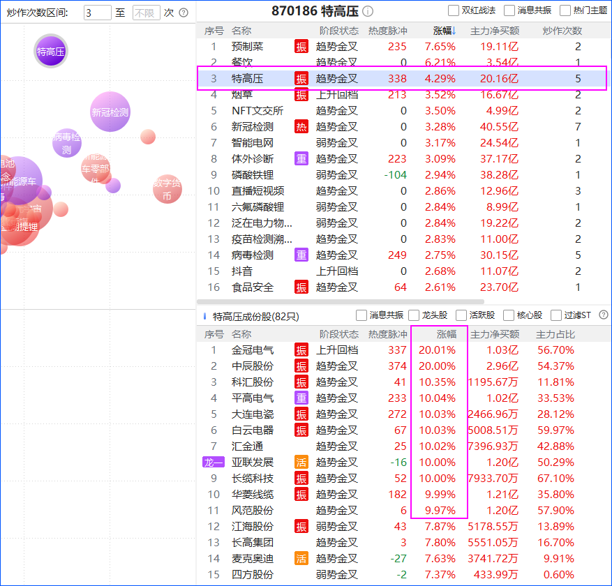 从主题猎手热点纵览看,今日特高压板块表现强势,领涨两市: