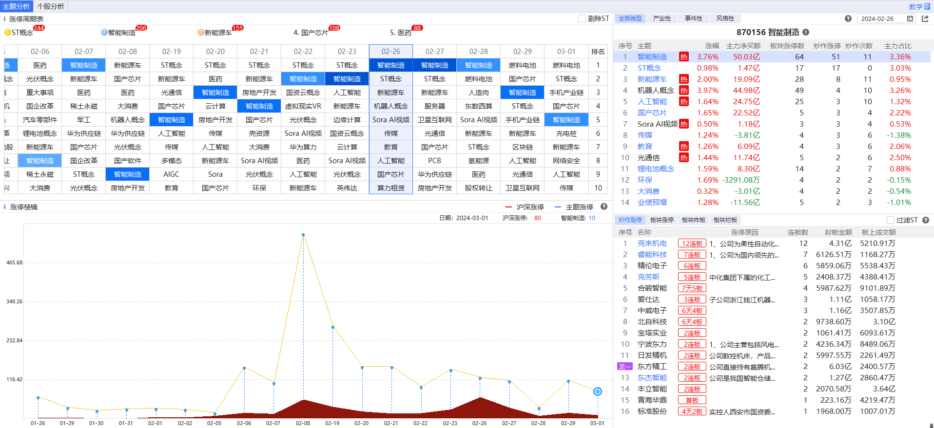 消息面上,中共中央政治局2月29日召开会议,指出要大力推进现代化产业体系建设,加快发展新质生产力。利好提振之下,补涨的东方精工超预期顶一字,卓翼科技首板助攻,睿能科技、爱仕达高位反包涨,工业机器人达意隆一字晋级3连板。
