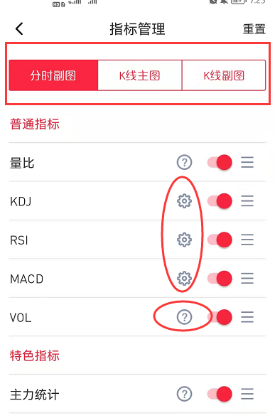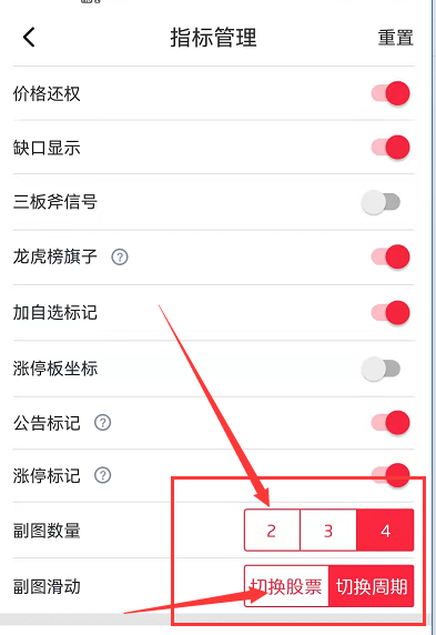 任意点一只股票,点击右侧的指标管理(如上图),中间副图数量数可以调节,最多副图显示4个,副图滑动设置,点击副图是切换下一个副图指标或者下一个股票。