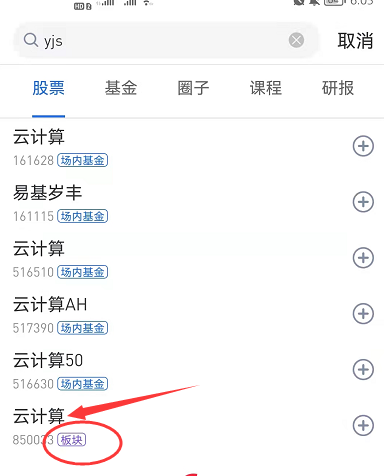 首字母或者打字搜索,如下图,找云计算板块个股,输入首字母yjs,选择最下面后缀词为板块的选项,点击打开