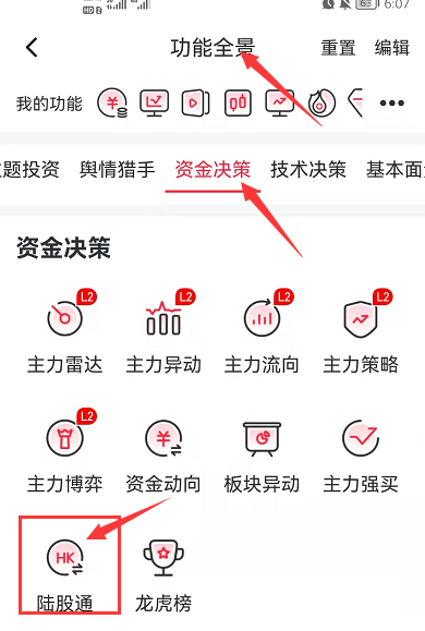 软件首页上方功能全景——资金决策模块,选择下面的陆股通,点开即可看到当天大盘北向资金流入情况以及北向资金当天主要买卖的个股。个股北向资金买卖点击任意北向资金标的股,划到最下面的资金流向,可查看陆股通(北向资金)净流入流出情况。