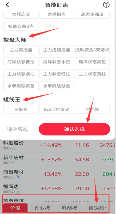 智能盯盘,打开软件智能盯盘,根据自己的板块以及选股需求,选择相应的特色指标选股,然后确认选择。下方可以选择盯盘的板块甚至是自选股。