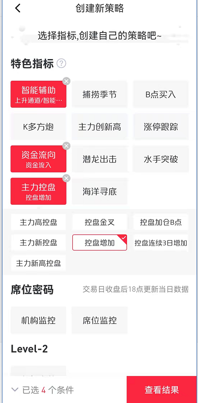 智能选股——点击我要制定策略,然后根据自身选股需求制定选股策略,点击查看结果,即可选出符合模式的个股
