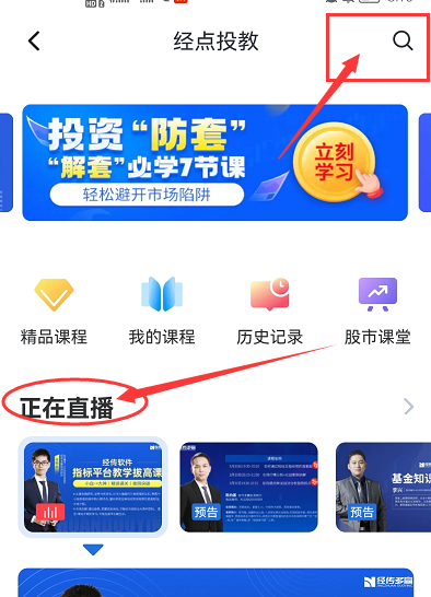 点击正在直播,即可看到目前正在直播的课程以及将下课的课程简介及预告,如果有喜欢的老师或者课程的,点击右上方的搜索,输入老师名字或者课程名称,即可查找到该老师或者课程的回放。