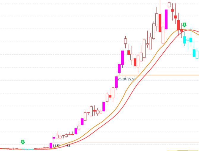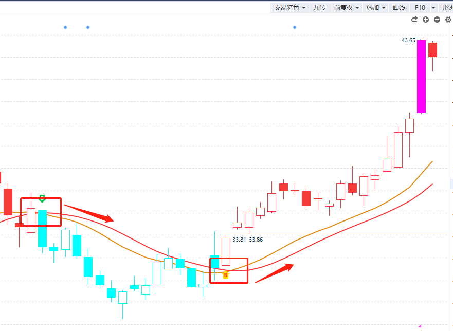 ③涨停变色:股票出现涨停板,对应的K线(10cm是紫色k线、20cm是黄色k线)