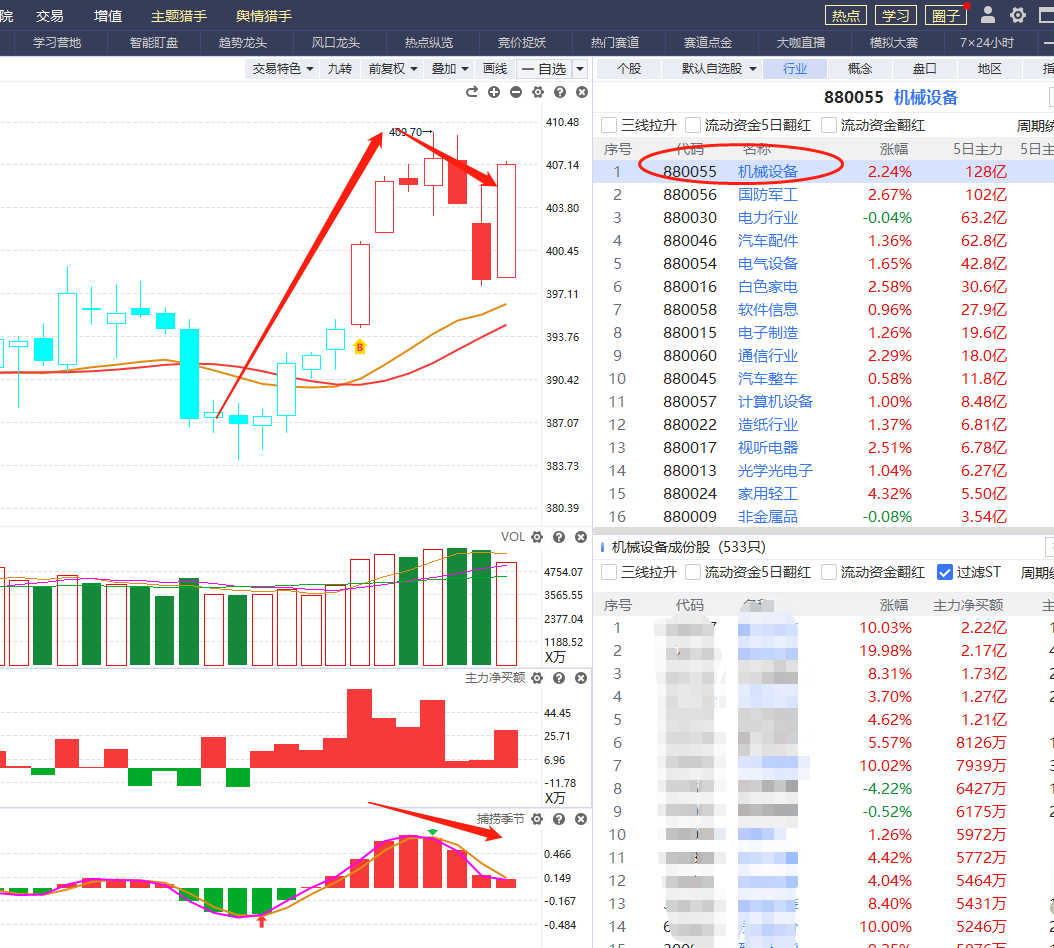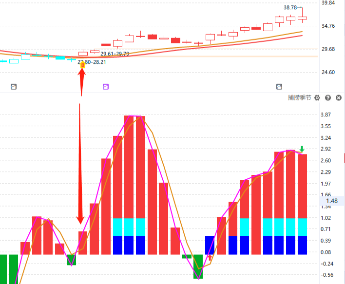 比如说机械设备板块,趋势在辅助线上,属于趋势向上的板块,符合条件,另外资金近期都是翻红,满足资金要求,最后看捕捞季节,处于死叉第4天,死叉末端,可以提前选好这个方向的个股等买点机会。