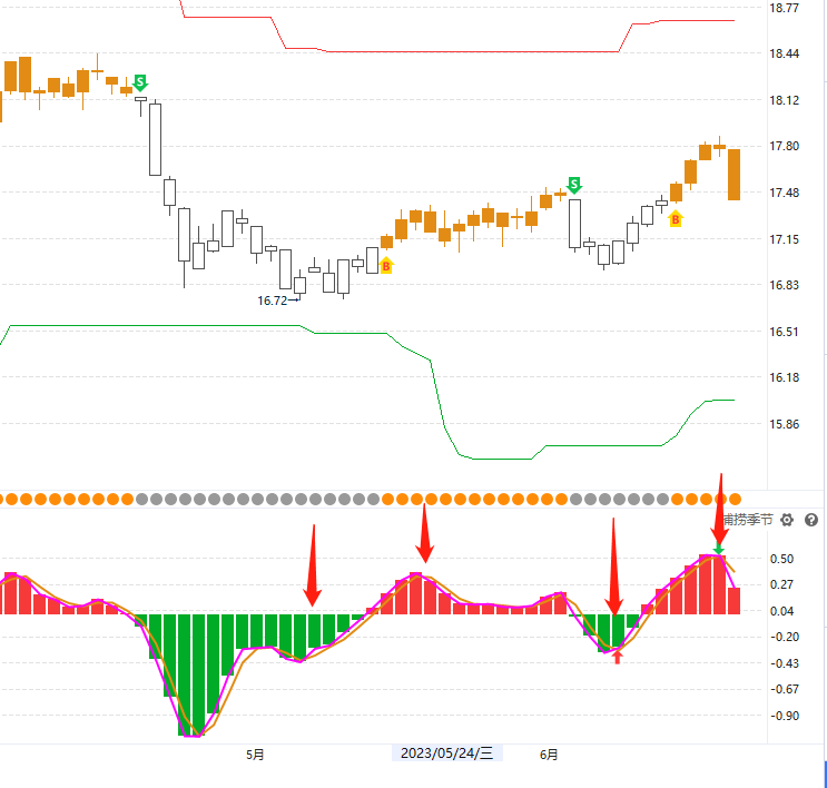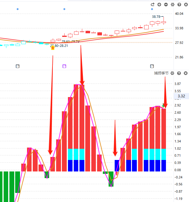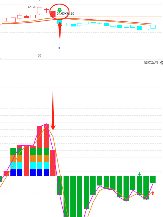 ③捕捞季节:大盘捕捞季节金叉,表示短期大盘进入反弹,很多板块和个股也启动金叉买点信号,是进场操作的时候;大盘捕捞季节死叉,表示大盘短期进入回调,板块和个股也进入死叉回调阶段,是做减仓的时候。