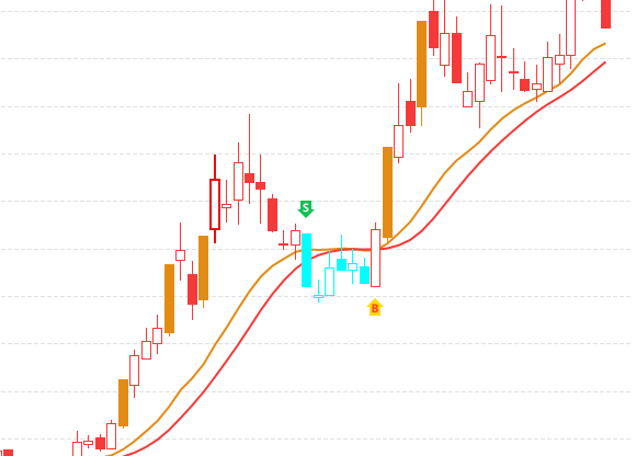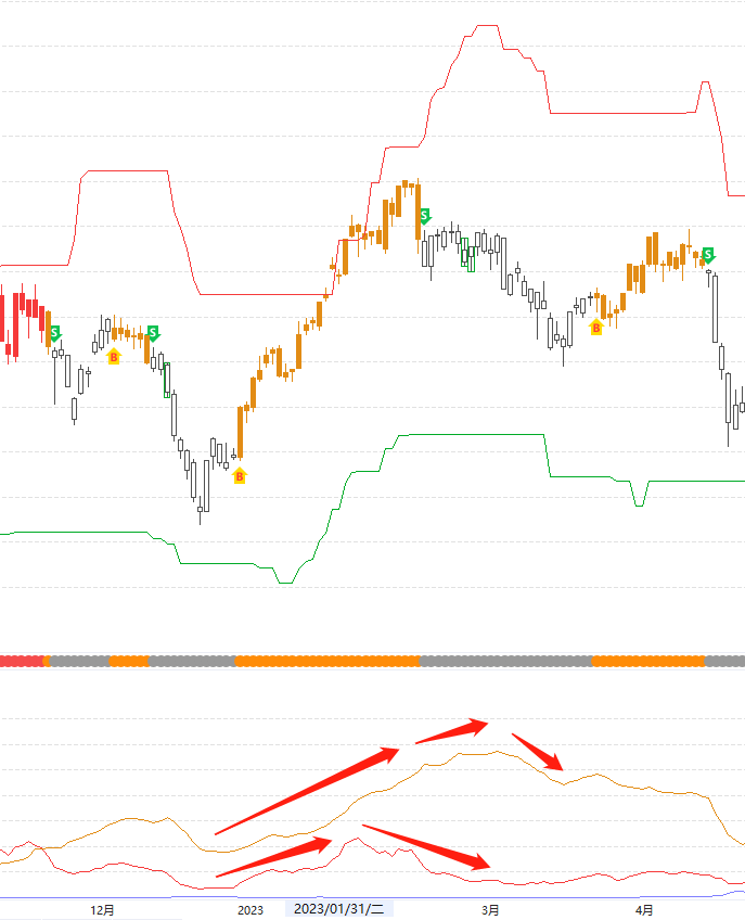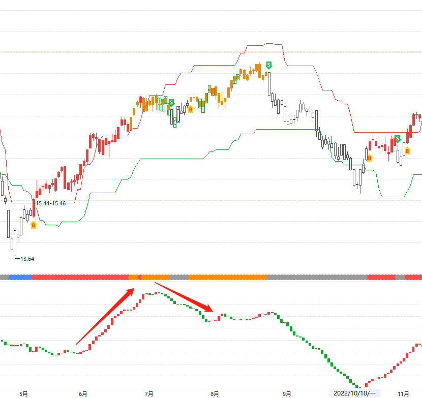 主图上有4种颜色的区域,B点包含了黄色和红色区,是行情好可操作的区域,黄色代表中线区域,红色代表短线追涨区域;灰色区伴随着S点信号的出现,代表风险释放区域,此阶段是要注意风险,控制好合理的仓位甚至要空仓休息;蓝色代表超跌区域,操作止跌反弹个股,一般不常见。因此,红黄区域是可重点操作的区域。