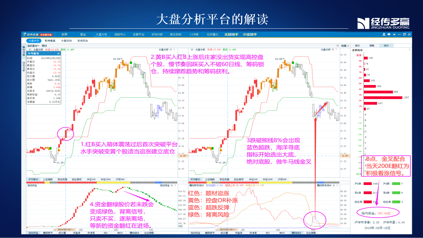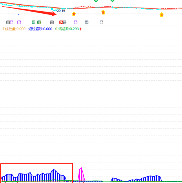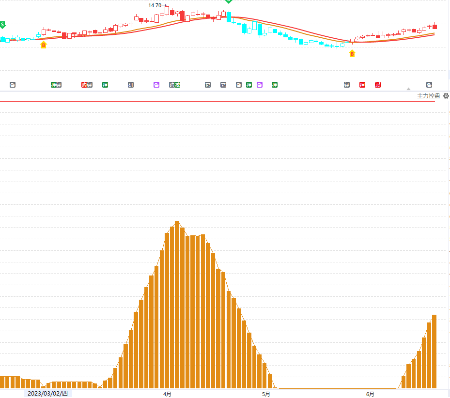 ③主力控盘:是中线资金指标,一般在大盘B点黄色区域,重点做控盘增加的个股,代表有中线的资金。