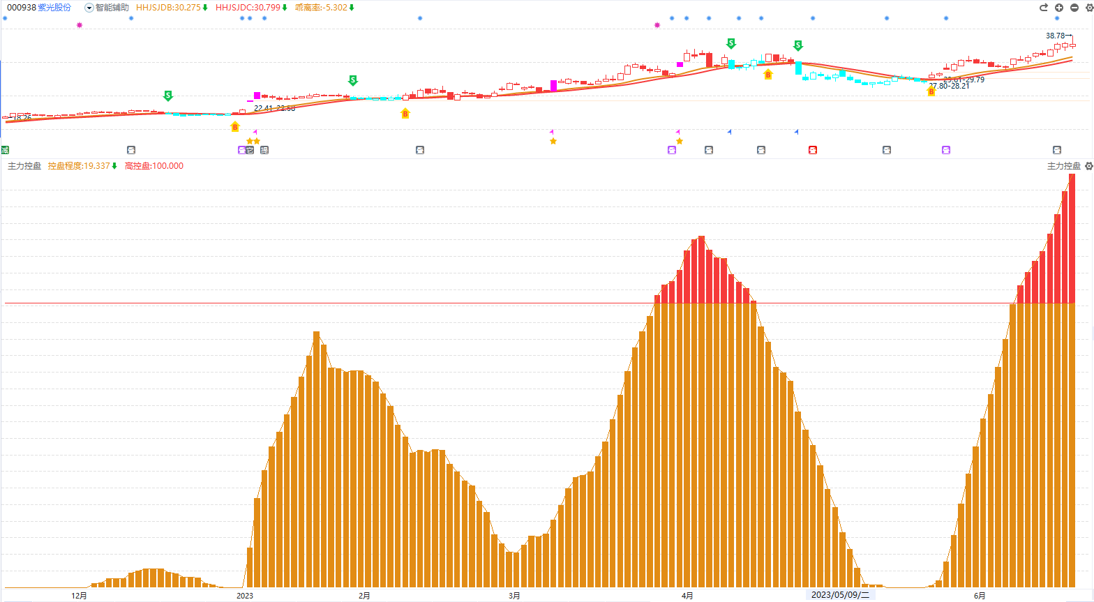 新控盘:出现的是黄色的柱子,黄色柱子持续增加的个股,说明资金在吸筹阶段,结合趋势、买卖点指标判断个股是否有介入机会。