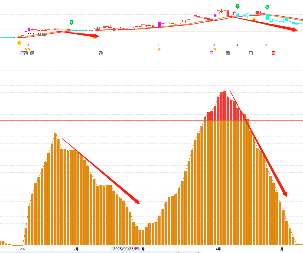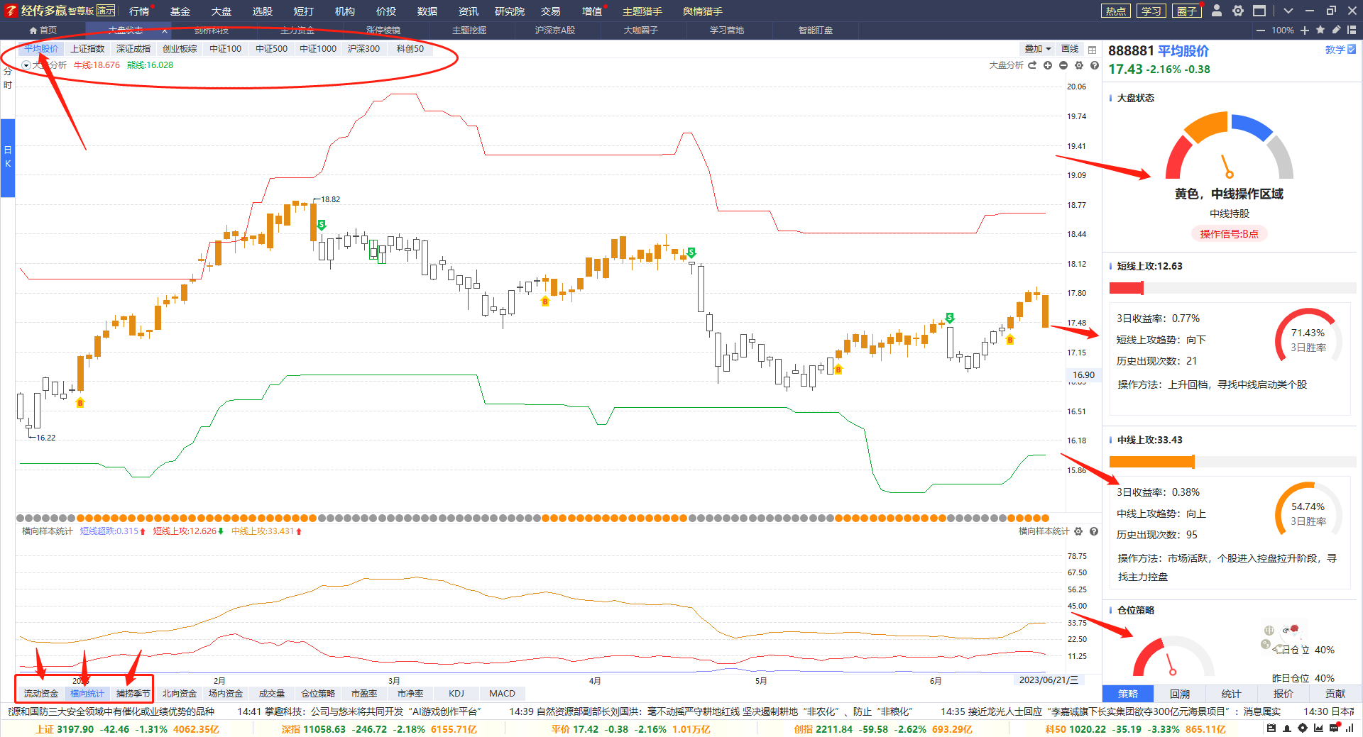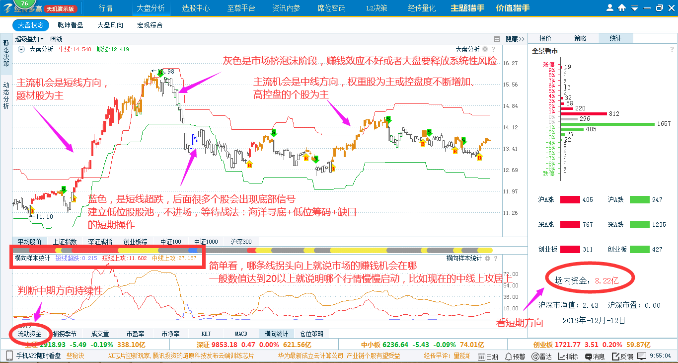 ②横向统计:统计市场个股是短线还是中线数量更多,黄色线在上方代表适合中线持股行情,红色线在上方代表适合短线持股行情。