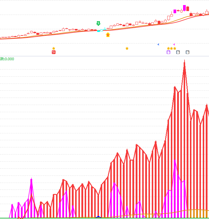 ④主力状态:股票出现紫色柱,表示有短线资金;出现红色柱子,表示有中线资金;出现黄色柱子,表示股票有控盘资金,相对应可以看主力控盘指标;出现蓝色或绿色柱子,表示股票资金弱势,趋势走坏,尽量避开不参与。
