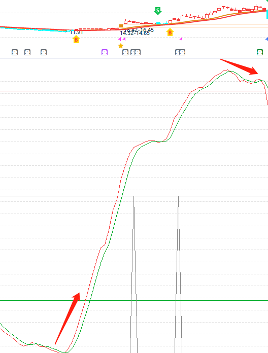 紫线上穿黄线为金叉,常说的金叉初期是金叉第1-2天,是买点信号;紫线下穿黄线为死叉,死叉初期则是死叉第1天,是短期减仓信号。