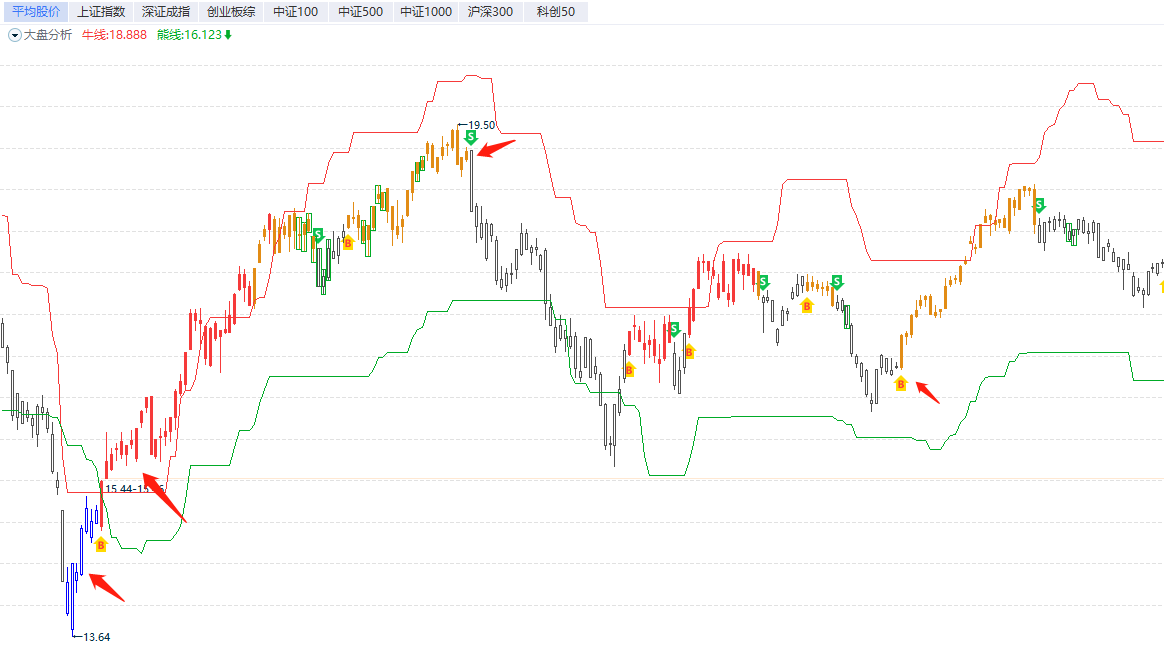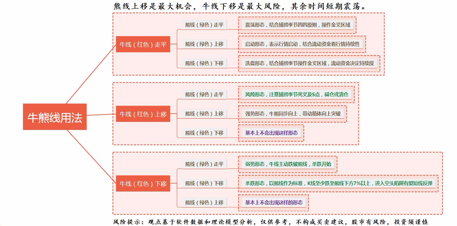 主图中的牛熊线,上方的红色线为牛线,下方的绿色线为熊线,对于牛熊线,有两种形态尤为重要:①牛线下移是最大的风险,市场下杀,控制好仓位;②熊线上移是最大的机会,上仓位操作的行情;③其他形态,牛熊线走平一般是震荡洗盘。
