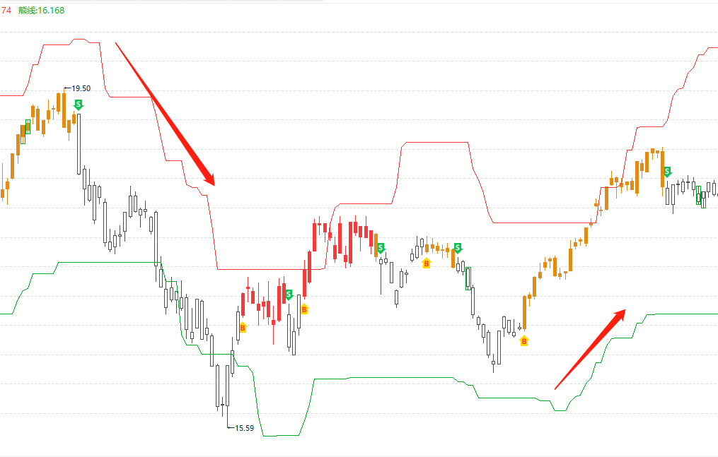水手突破:由4条趋势线组成,从上往下是强——弱的过程,其中紫色是趋势最强,绿色是最弱。