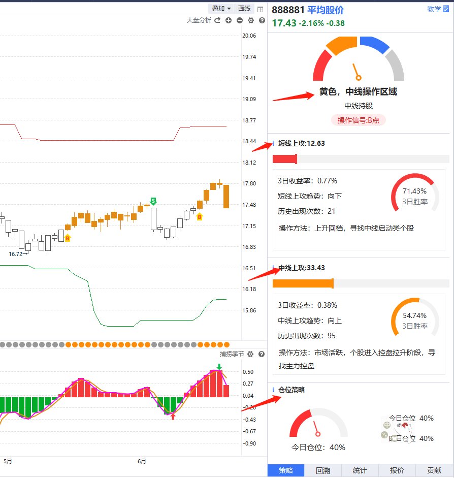做中线的话,重视黄色的中线上攻走势,持续拐头向上走是比较多中线个股的机会,中线上攻向下走则是市场上中线个股减少,策略要做调整。