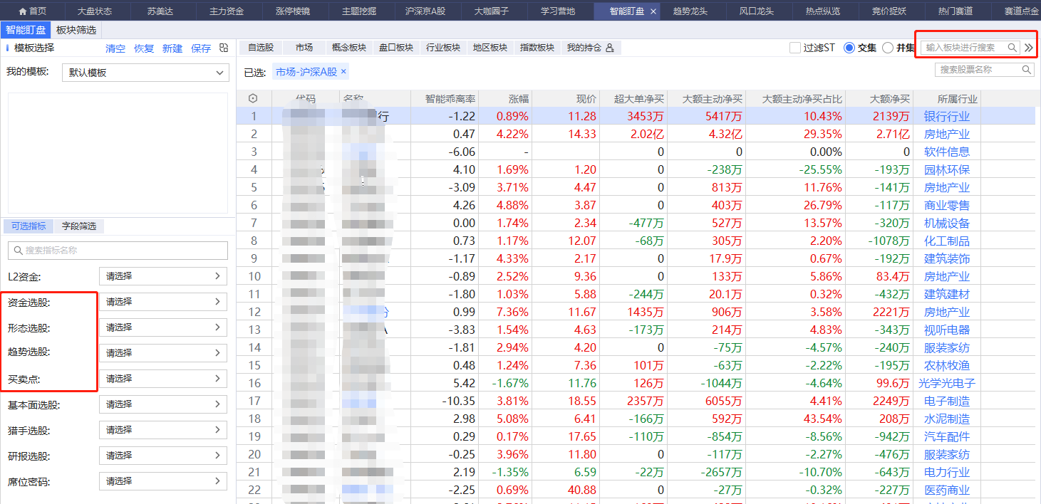 左边是常用的选股公式,趋势、资金、买卖点这些是经常用到的条件,右上角还有一个搜索框,可以筛选某个板块概念个股。