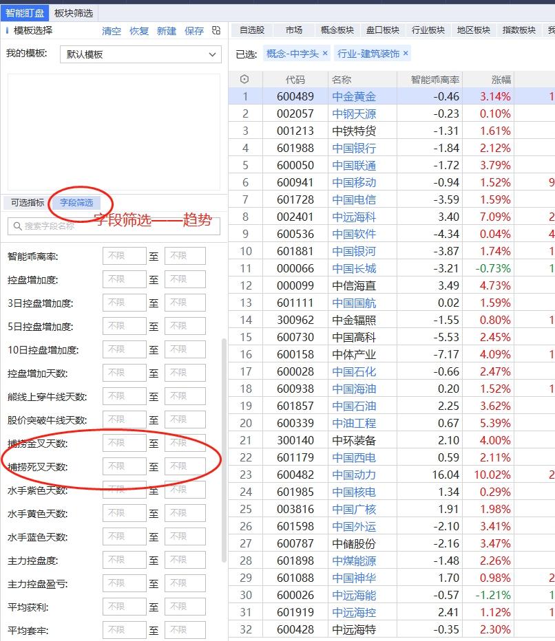 另外,字段筛选——趋势里也有些常用的条件,比如乖离率、控盘度、捕捞季节等,直接输入数值做进一步的精选。