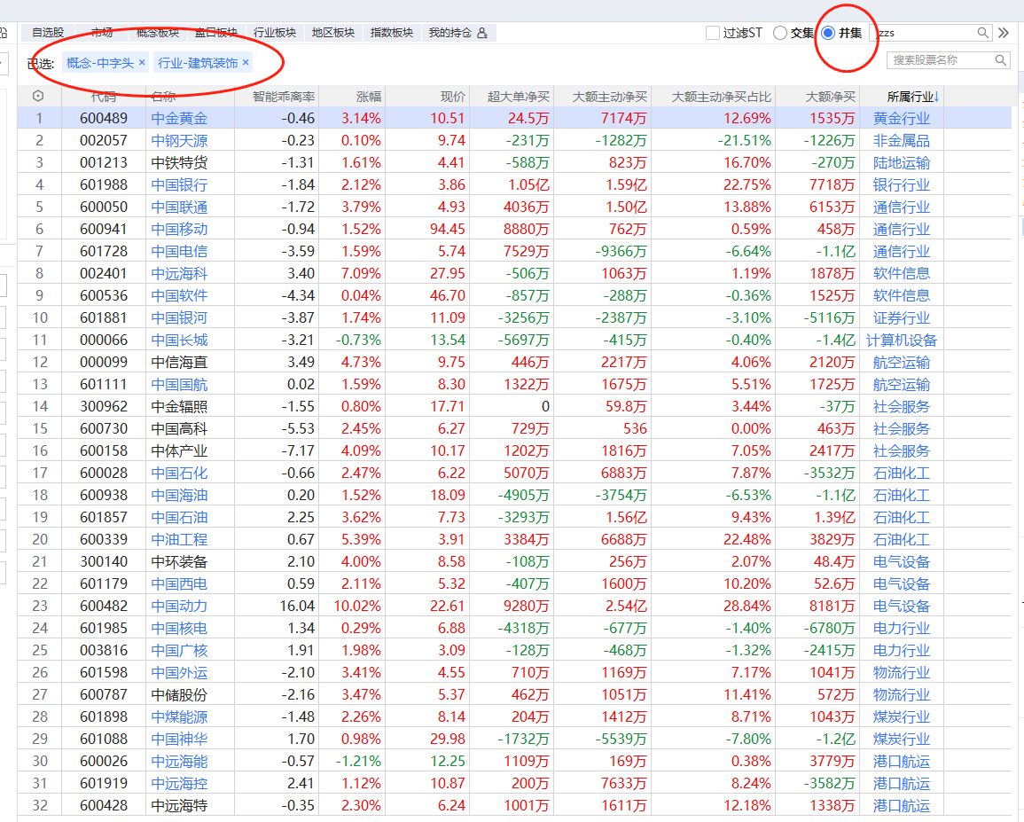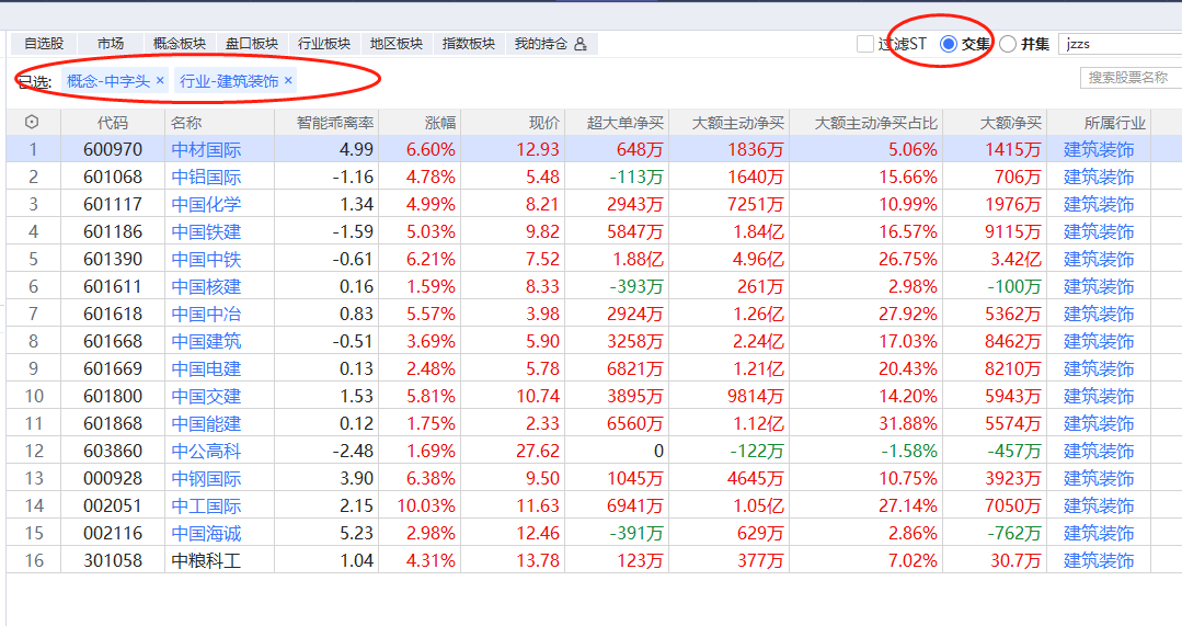交集是同时符合所选的板块概念的个股,比如搜索【中字头】和【建筑装饰】两个板块,交集选股,选出来的股票就是既有中字头概念,又是建筑装饰板块的。