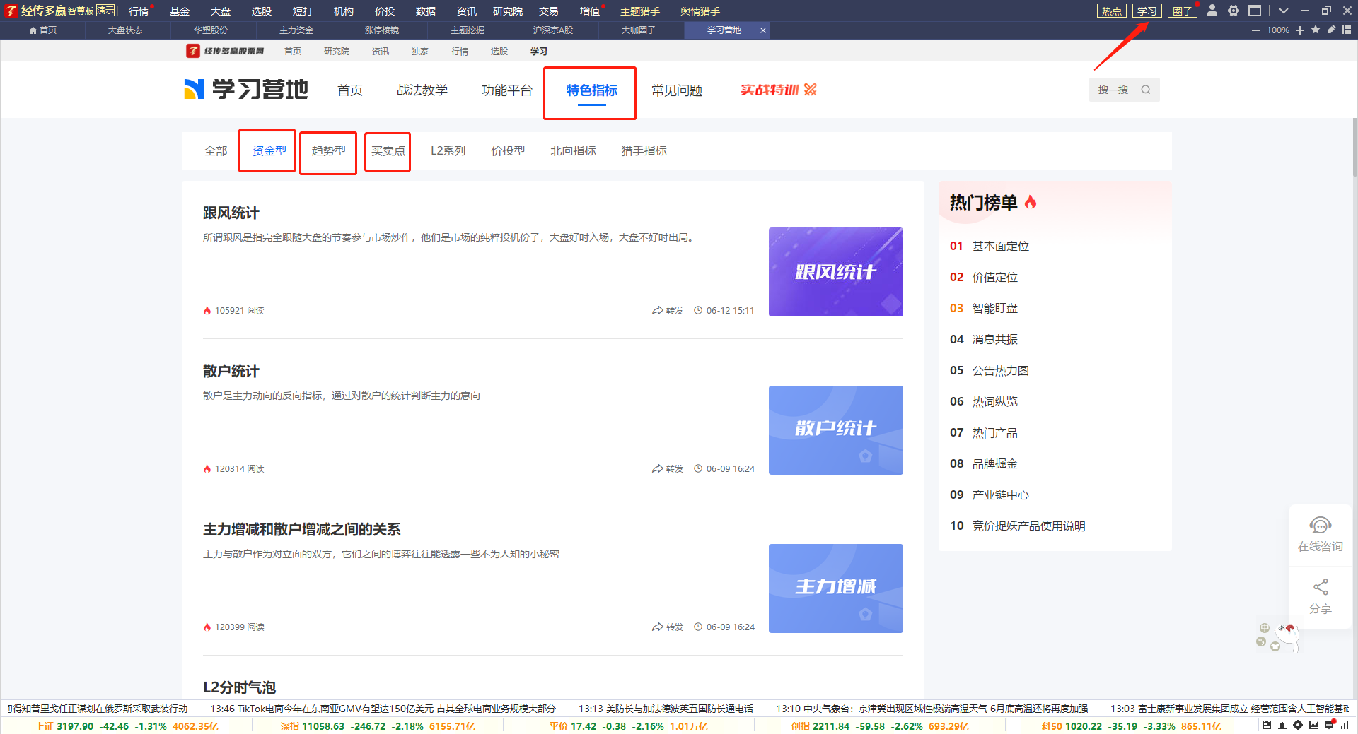 电脑端:右上角【学习】——【特色指标】,找到以上常用指标的小视频来学习