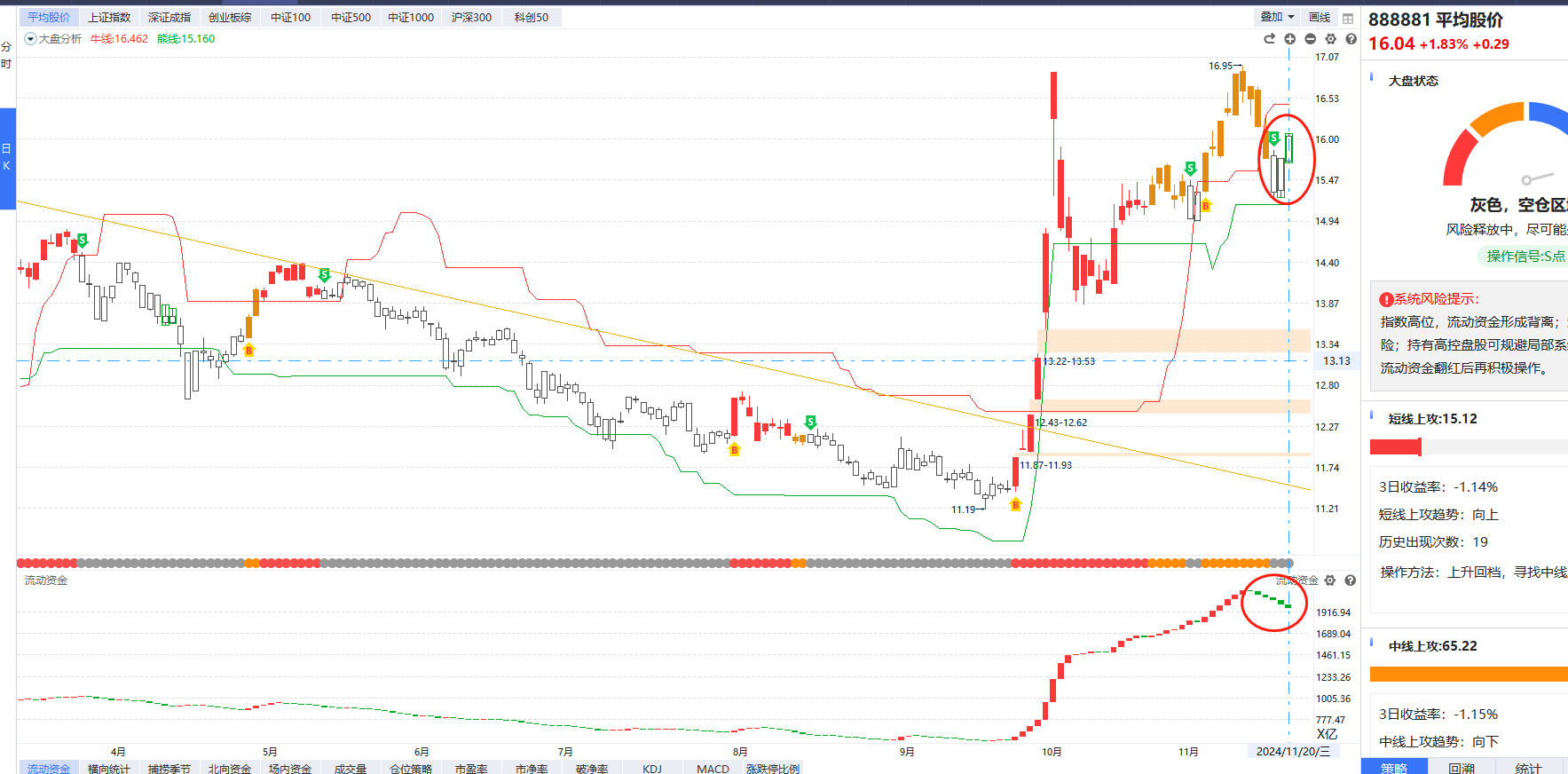 今天平均股价 流动资金连续翻绿,S点的第3天,我之前有说过 短命S点的特征: 时间短,修复快,最晚不能晚于本周五,也就是周五之前需要出B点,出了B点 皆大欢喜,接着奏乐接着舞。如果 不出B点 代表 市场开始走弱,11月份的行情 告一段落了也。 但今天有用户问我,老师 如果走弱的话 会不会 又重新回到以前的熊市状态中,我认为并不会,一张图 就能做了解释。