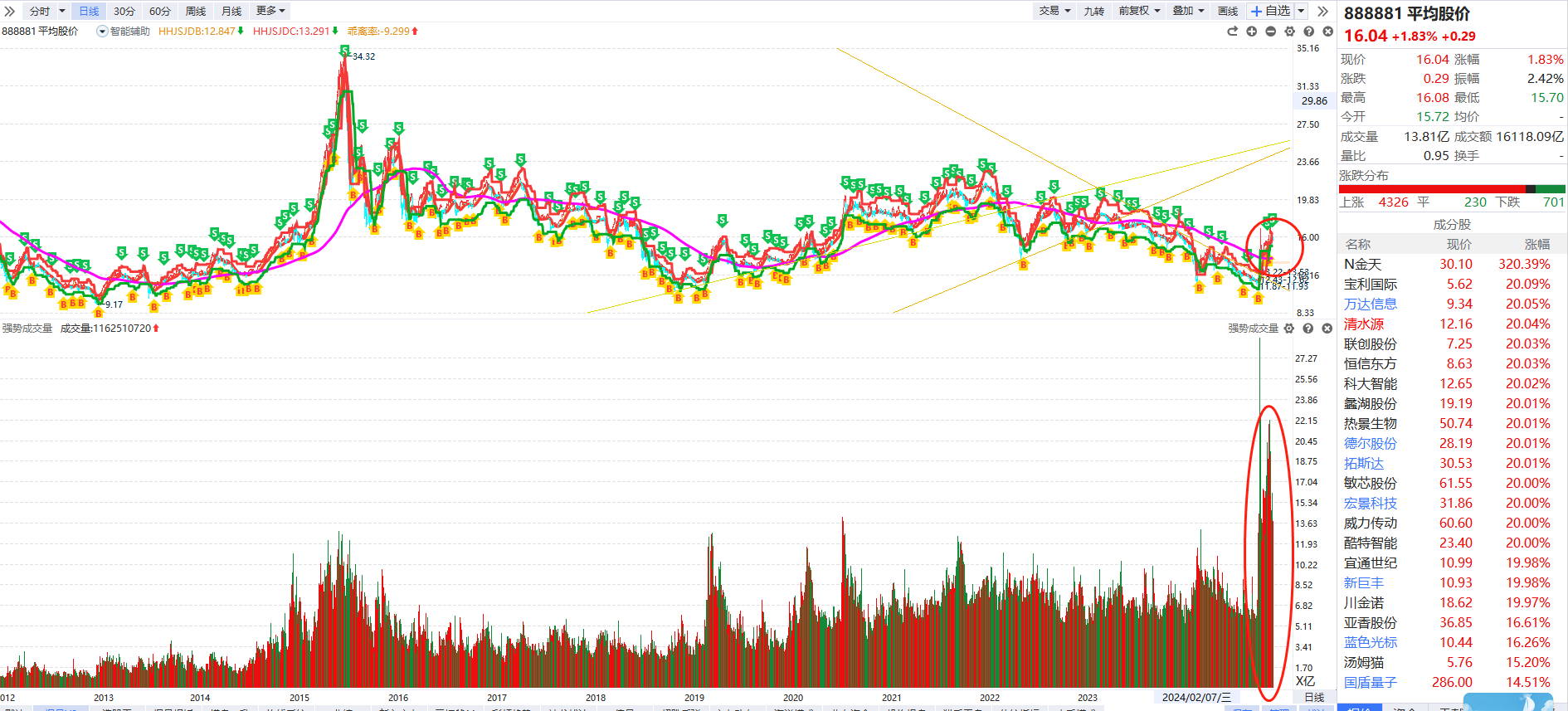 平均股价这种成交量和这种位置 是以前绝无仅有的,所以牛不会轻易离去,只是走的慢一点而已。当下的仓位目前还是建议3-5成仓位,如果周五平均股价B点不出现,那么仓位降到3成以内