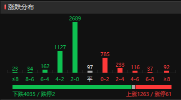 下跌个股4035只,大涨个股92,大跌个股23,赚钱效应较差,涨停板61个,连板14个,连板效应良好,最高板7板。