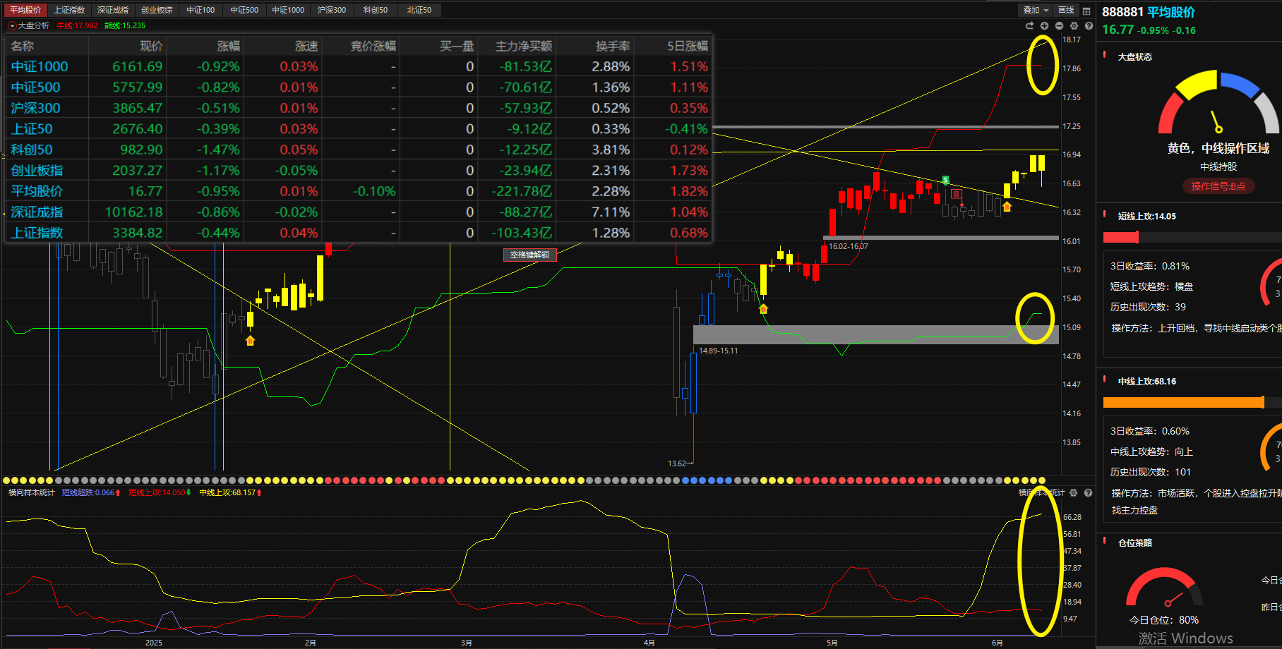 总结:指数早盘震荡,午后快速杀跌,尾盘反弹。 午后波动比较大,主要原因中美之间的谈判没谈拢,午后贸易港口、农业方向大涨,消息面再次出现了扰动。 目前是死叉的第一天,昨天复盘也提醒了即将死叉的额问题,所以短期有继续调整的可能,平均股价还在B点范围,所以本次调整是机会。 板块上预计会有所变化。 死叉阶段需要注意的问题是个股容易冲高回落大家注意。 仓位继续控制3到5成操作即可。