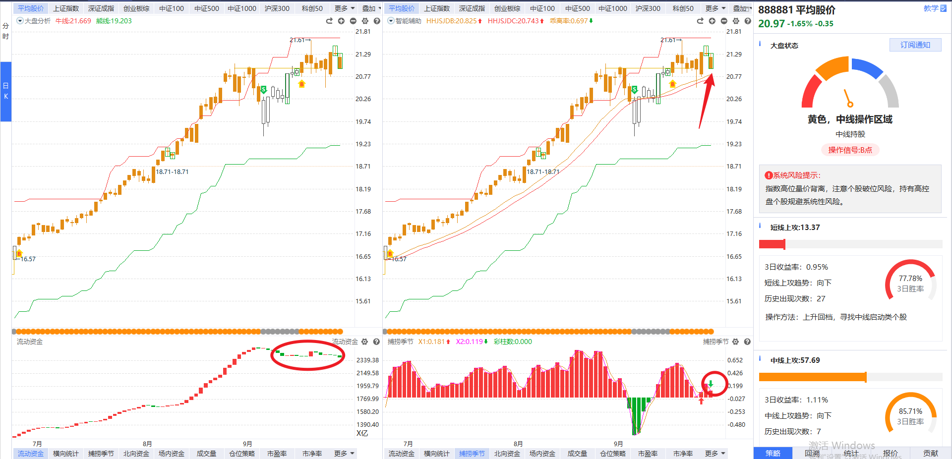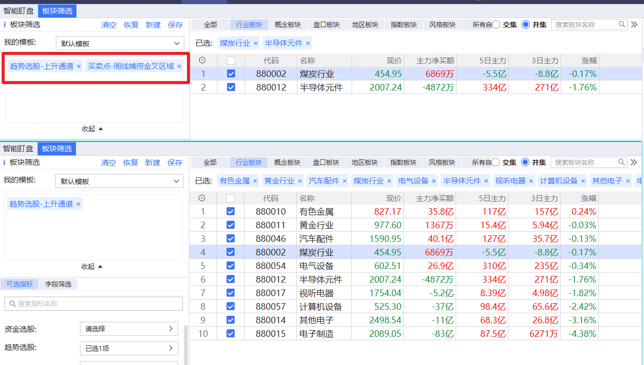智能盯盘——板块筛选——符合上升通道:目前市场62个行业板块中,只有10个板块趋势向上,说明大部分板块以及个股呈现下降趋势中,普遍机会不多;盯盘符合上升通道+周线捕捞金叉区域只有2个,分别为煤炭行业(死叉多天)、半导体元件(死叉2日),重点留意后趋势和资金向好,留意月线和周线金叉区域的个股低吸机会。对于前期涨幅高的方向进入周线死叉还是要谨慎参与的。