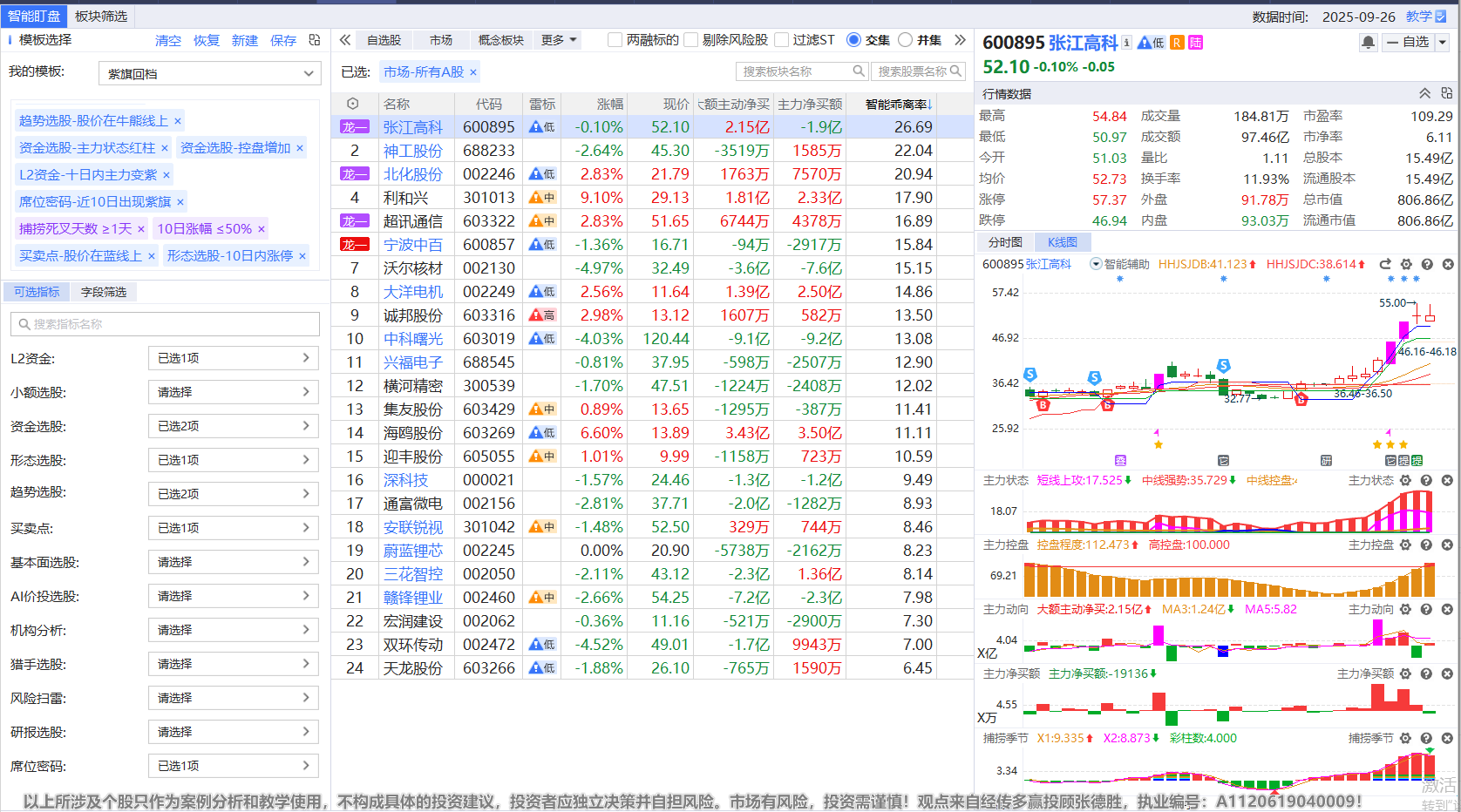 注意:选股≠买股,《紫旗回档》做回档低吸,在个股在整过程中如不符合选股条件或者出现走弱(如出现主力控盘递减、跌破智能辅助线、主力动向蓝柱、流动资金连续翻绿3天以上、回档跌破熊线收不回等),记得剔除自选池。