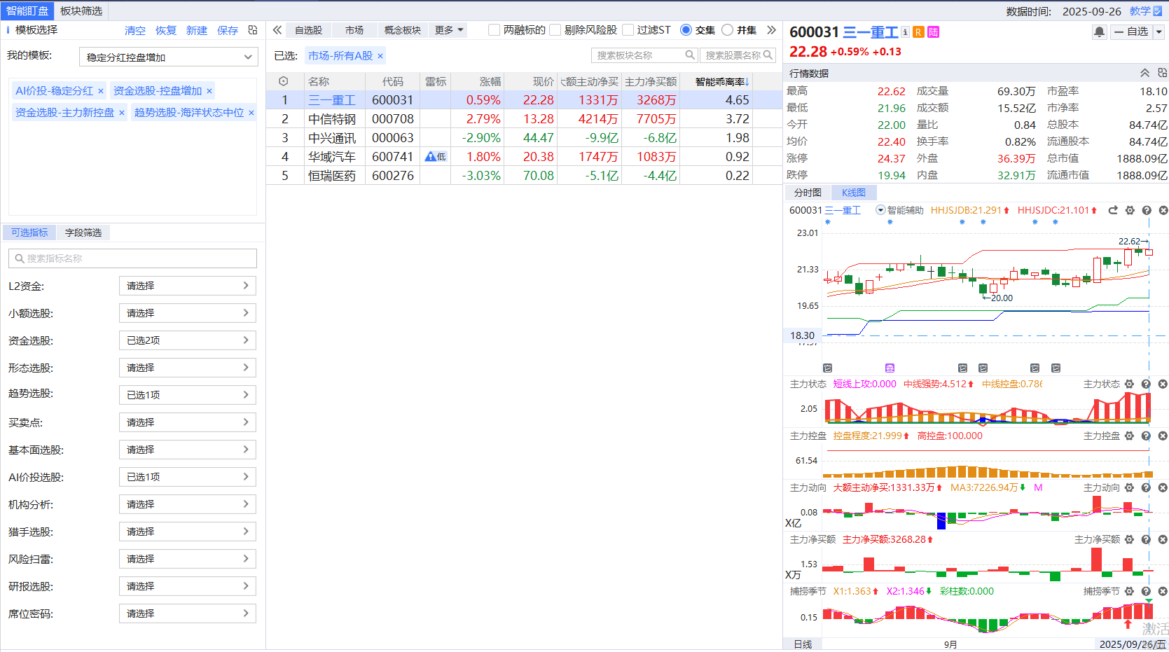 智能盯盘设置:稳定分红+控盘增加+主力新控盘+海洋状态中位 ,优选低位启动或者近期涨幅不高类型个股,符合的有【三一重工 600031、中信特钢000708】等。