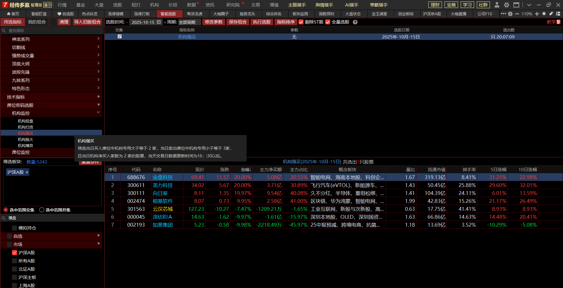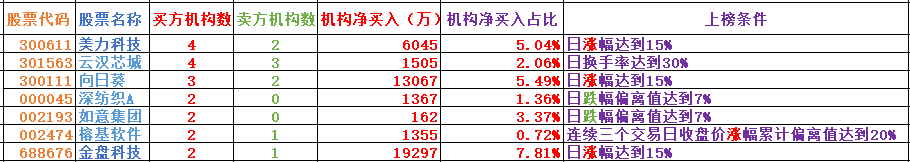 6.每日席位解读(主要是对个股的席位和软件指标进行一些解读,更好的理解席位的用法和软件信号,非荐股,对于机构席位大幅买入的品种,从逻辑上来讲是机构看好的预期,对这类品种需引起思考,对于选取做点评个股的逻辑主要是以下几点:机构净参与家数、机构席位净买金额、净买金额占比等)。