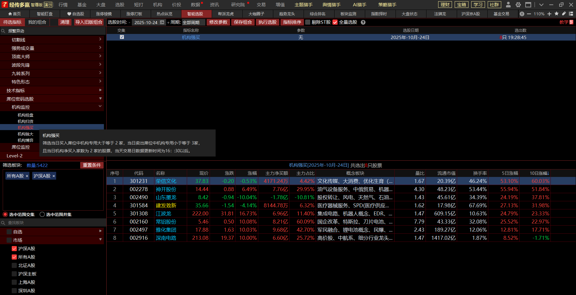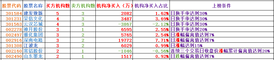6.每日席位解读(主要是对个股的席位和软件指标进行一些解读,更好的理解席位的用法和软件信号,非荐股,对于机构席位大幅买入的品种,从逻辑上来讲是机构看好的预期,对这类品种需引起思考,对于选取做点评个股的逻辑主要是以下几点:机构净参与家数、机构席位净买金额、净买金额占比等)。