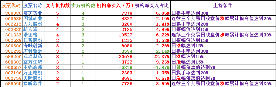 6.每日席位解读(主要是对个股的席位和软件指标进行一些解读,更好的理解席位的用法和软件信号,非荐股,对于机构席位大幅买入的品种,从逻辑上来讲是机构看好的预期,对这类品种需引起思考,对于选取做点评个股的逻辑主要是以下几点:机构净参与家数、机构席位净买金额、净买金额占比等)。