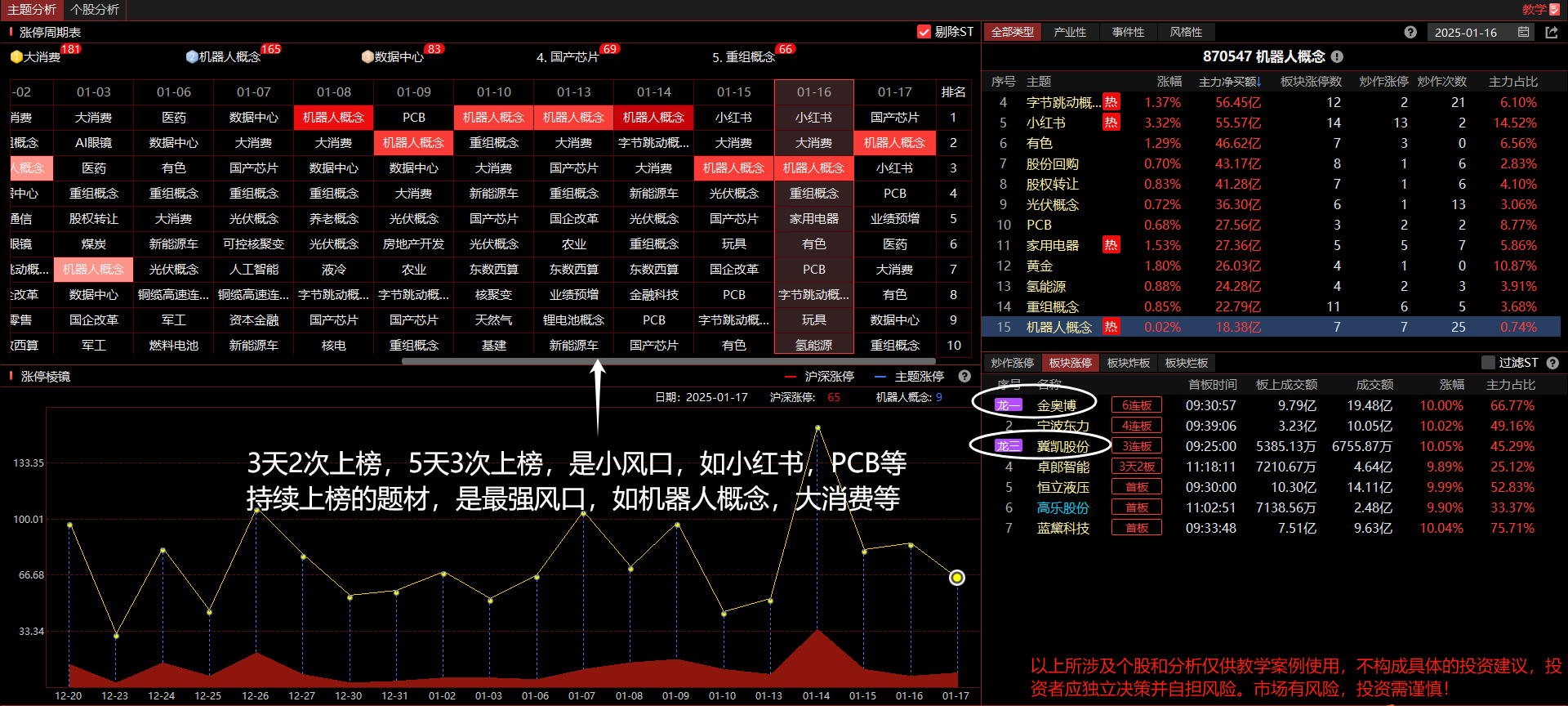 并不是每一只股票做低吸都能成功的,我们需要针对性的去筛选,做短线低吸应该是找热点主题方向的龙头,热点意味着有资金在炒作,龙头代表的是题材里头最强的成分股,有带头作用,只要题材持续炒作,那么龙头就有可能持续走上涨行情,这时就可以用到我们主题猎手涨停棱镜的功能,先筛选主题风口,怎么判断一个题材是风口呢,很简单,看涨停周期表,3天2次上榜,5天3次上榜,就能形成短期风口,如果连续上榜的话,那就是持续性最强的风口,找准风口之后,接着再找每个风口的龙头,有龙一,龙二,龙三;然后把他们分别加入到我们的自选股池里面,当天能够上龙虎榜更佳,最好是带有紫旗的,紫旗的意思就是有机构席位参与的龙虎榜。