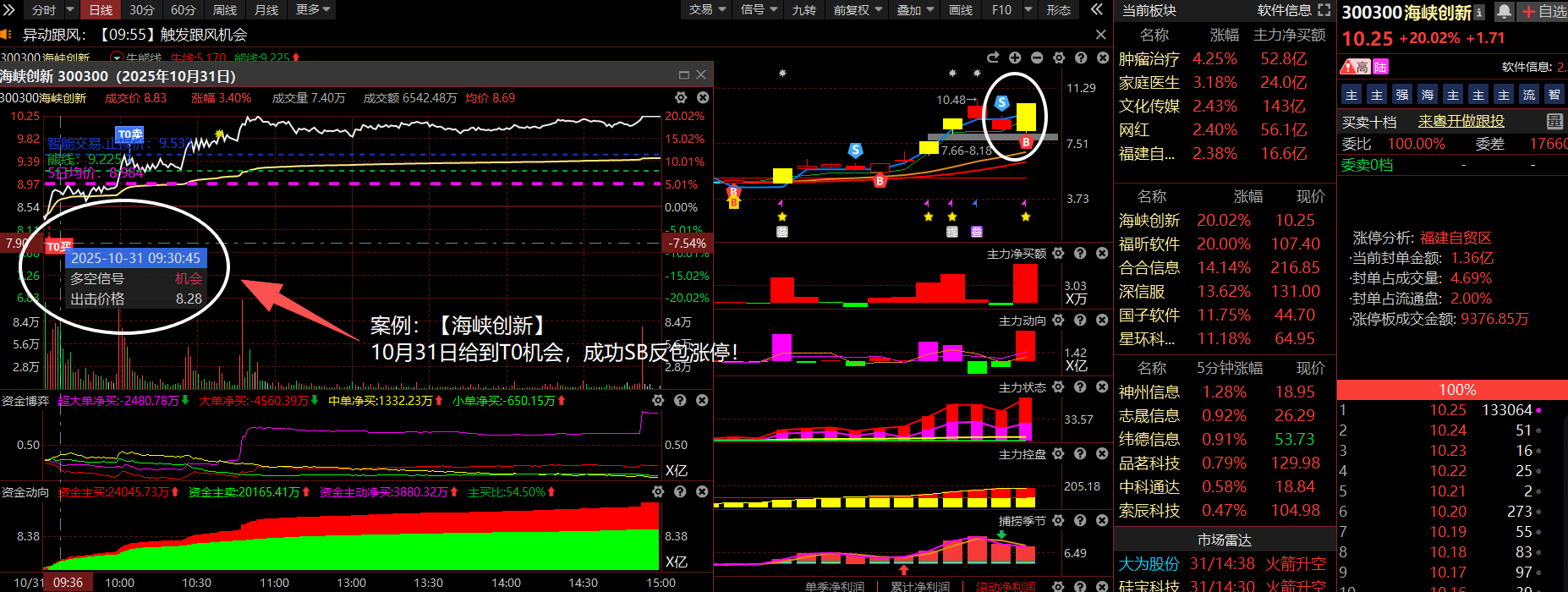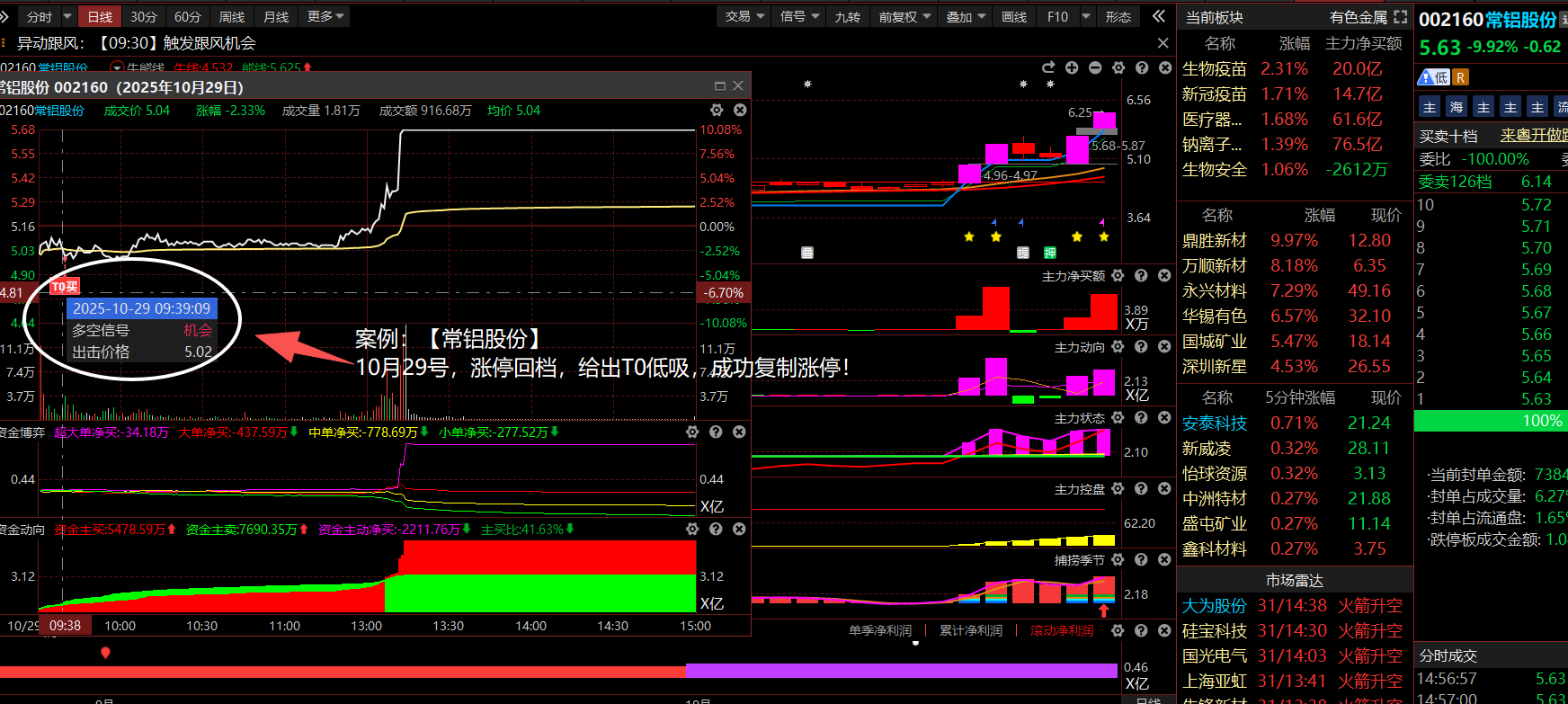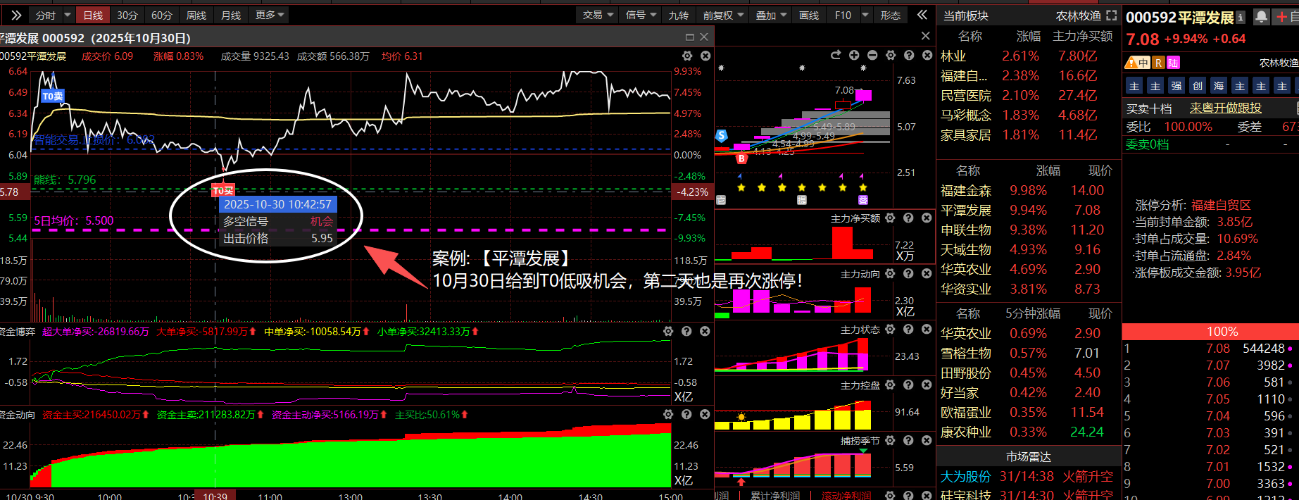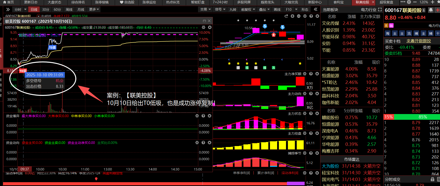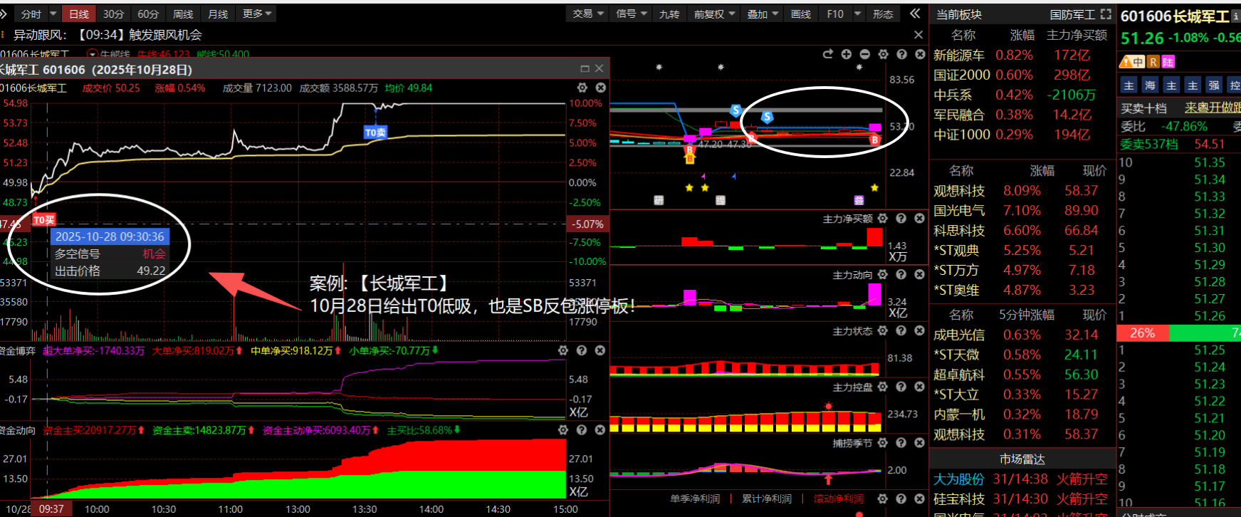 2. 如果有发出T0信号的,则先看股价是否有脉冲到分时0轴以上再考虑,这时买点是等股价冲高回落到水下支撑线或T0价格作为参考,回落下来资金指标不能出现双绿,否则不符合低吸策略;