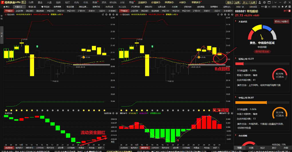 总结:b点区域,流动资金翻红,机会越来越多,但主线不明确。板块依然以轮动为主,操作上尽可能选择回踩低吸这一策略,防止板块轮动出现高位被套。