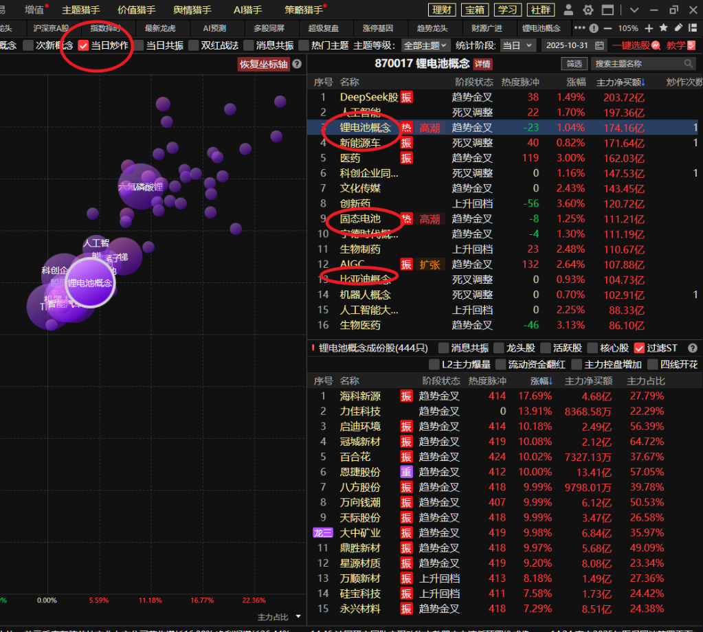 同时打开热点纵览,勾选当日炒作,可以看到锂电池概念,新能源车,固态电池,宁德时代概念,比亚迪概念,钠离子电池,锂电池隔膜等一些新能源电池细分题材出现炒作。