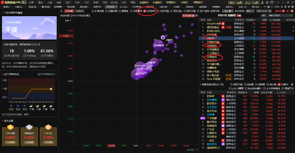 那么可以打开热点纵览,勾选当日炒作,判断医药炒细分题材,可以看到:创新药,生物制药,生物医药,病毒防治,仿制药等,从资金流入百亿且靠前来看,创新药资金受众度最明显,后续重点关注医药细分就要以创新药方向为主。