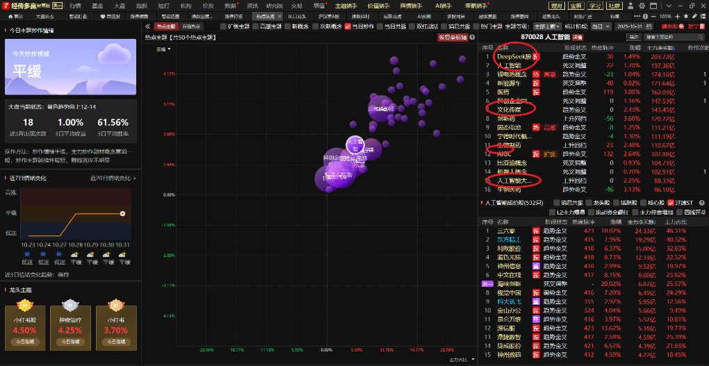 人工智能+传媒:值得注意的是,人工智能+传媒虽说没有上榜活跃,但从最近炒作主题和资金流入看,二者方向出现了明显异动,值得去关注和跟踪其机会。