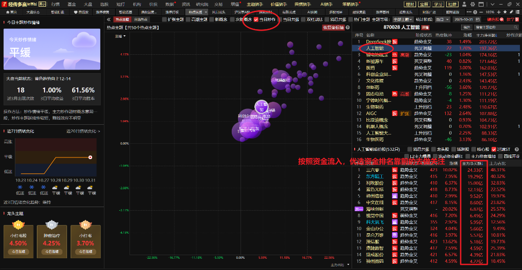 如果龙头股,活跃股,核心股都已经涨高或者没有合适的进场时机的,可以根据主力资金去做排序,优先选择资金流入排名靠前的头部票去做跟踪。