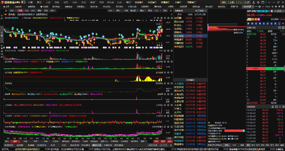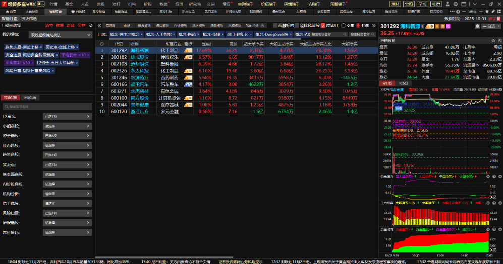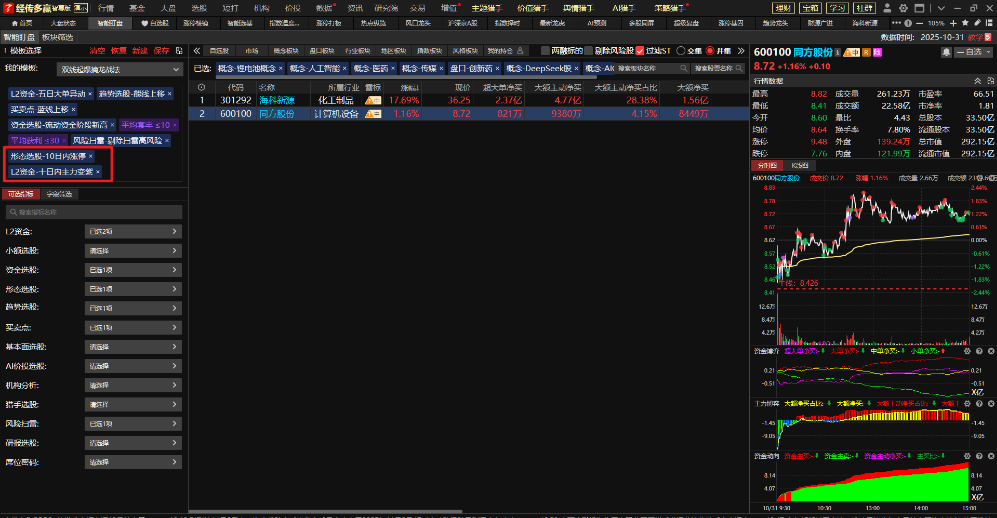 如果想做短线强势股的涨停复制,可以在原有的选股基础上增加10日内有涨停+10日内主力变紫。优选后符合选股模型的只有:海科新源和同方股份