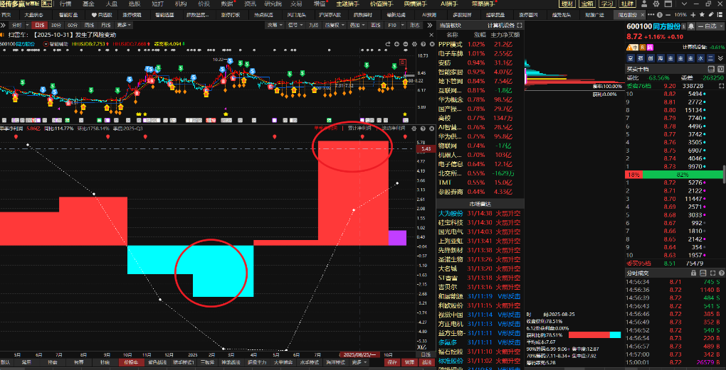 技术面:主力动向变紫+涨停突破牛线,底部启动形态