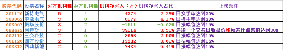 6.每日席位解读(主要是对个股的席位和软件指标进行一些解读,更好的理解席位的用法和软件信号,非荐股,对于机构席位大幅买入的品种,从逻辑上来讲是机构看好的预期,对这类品种需引起思考,对于选取做点评个股的逻辑主要是以下几点:机构净参与家数、机构席位净买金额、净买金额占比等)。