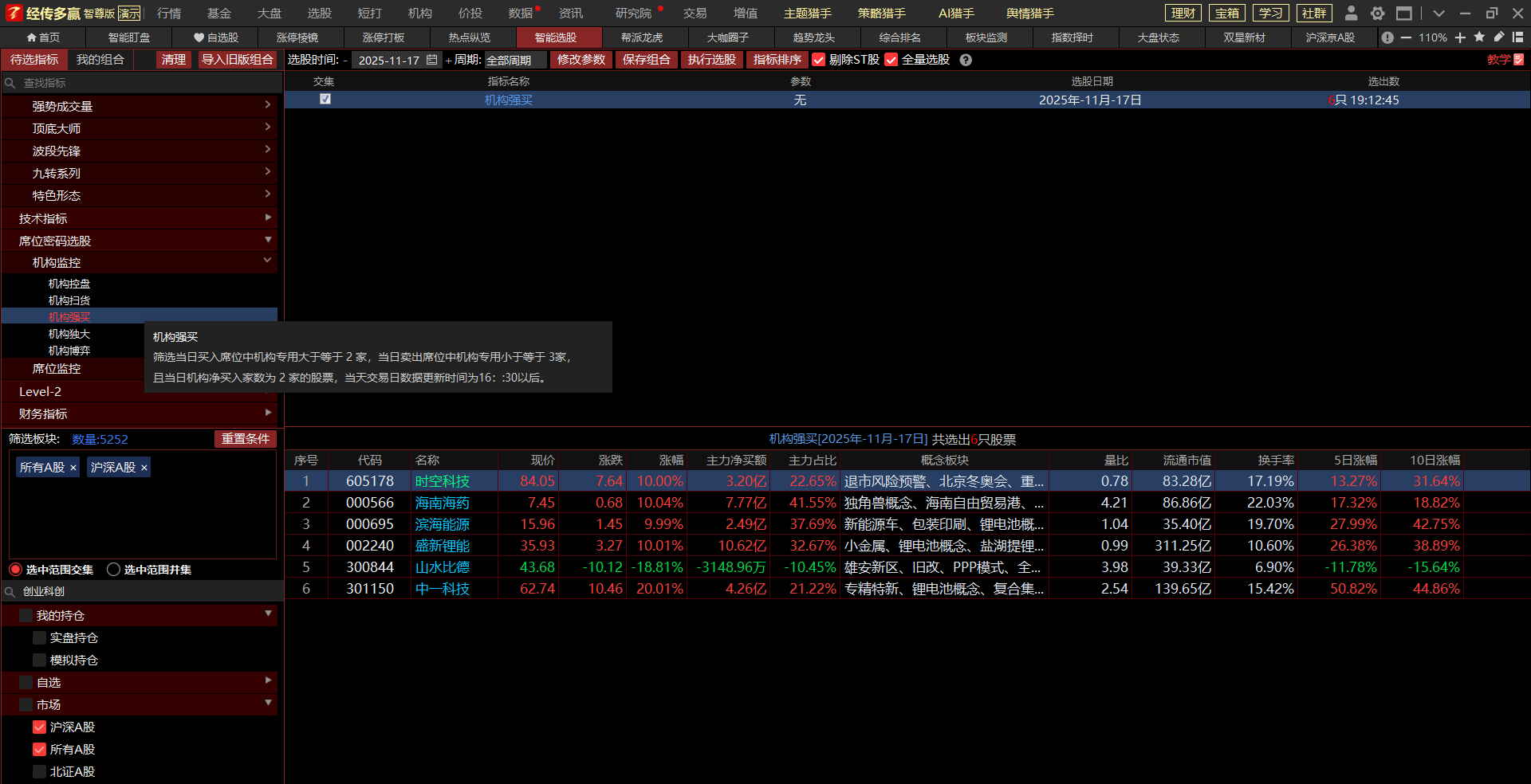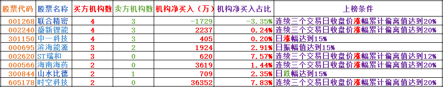 6.每日席位解读(主要是对个股的席位和软件指标进行一些解读,更好的理解席位的用法和软件信号,非荐股,对于机构席位大幅买入的品种,从逻辑上来讲是机构看好的预期,对这类品种需引起思考,对于选取做点评个股的逻辑主要是以下几点:机构净参与家数、机构席位净买金额、净买金额占比等)。