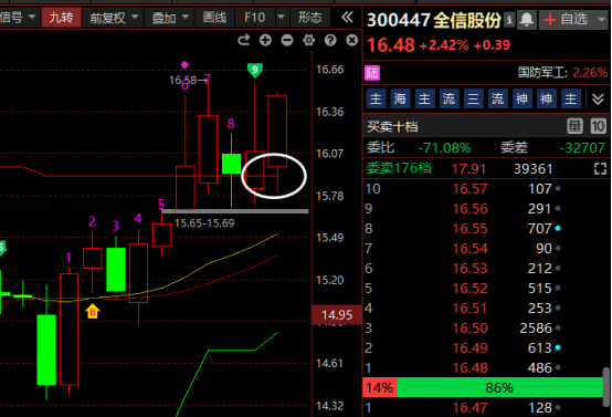 【全信股份】也是航天这个热点板块的,因为前期没有涨停板,所以走势比较弱的,属于启动类型,回踩牛线符合支撑位买入信号。