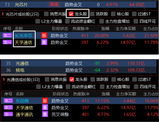 通过【热点纵览】可以查对应热点的龙头股,比如【光芯片】的龙头是长光华芯和天孚通信。
