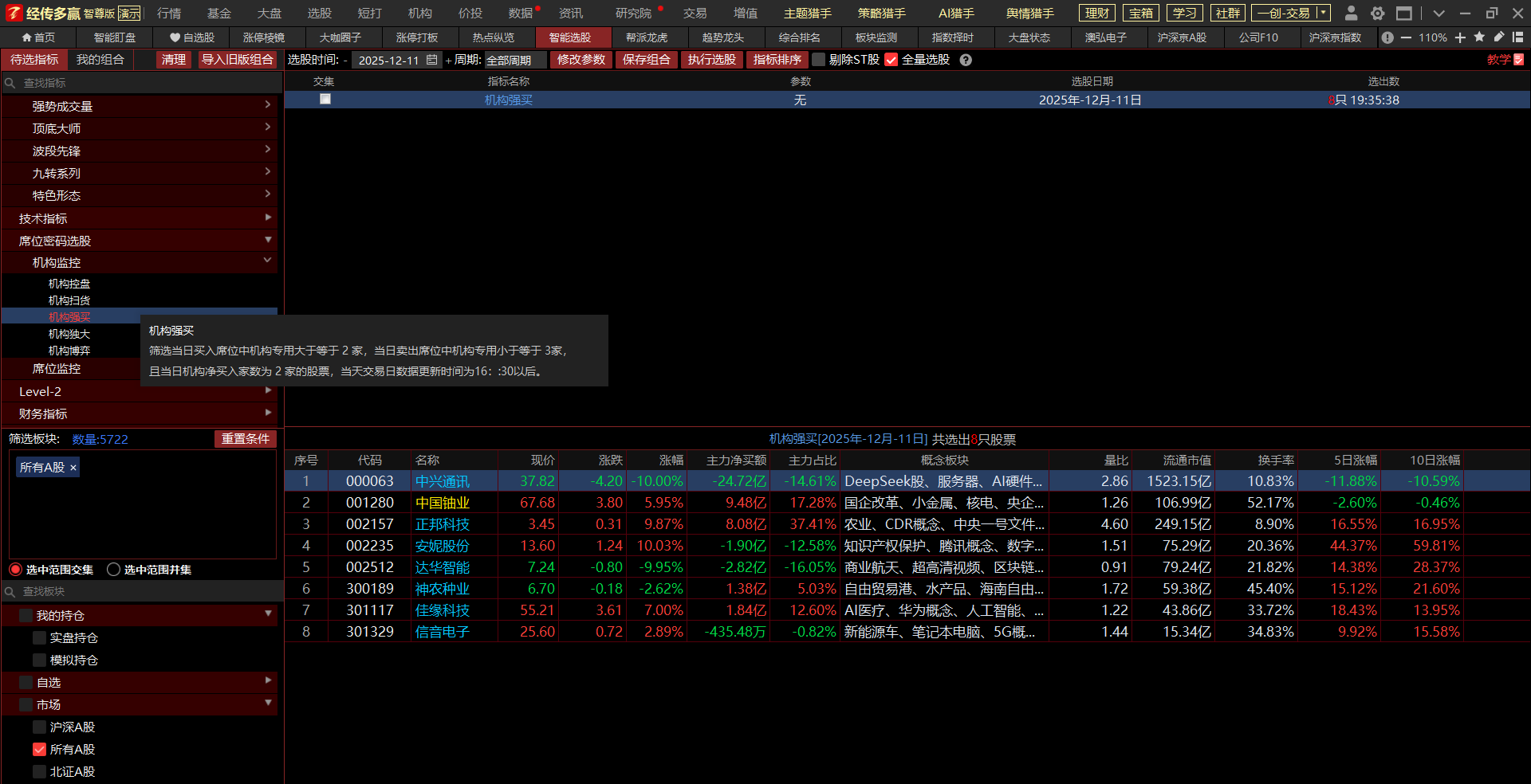 从今天上榜的席位密码数据来看,2家及以上机构席位现身买方,机构专用席位净买入在1家以上的有8家公司,净买入金额介于289万到6.32亿之间 ,今日不对具体个股的席位密码数据以及软件信号做相关解读