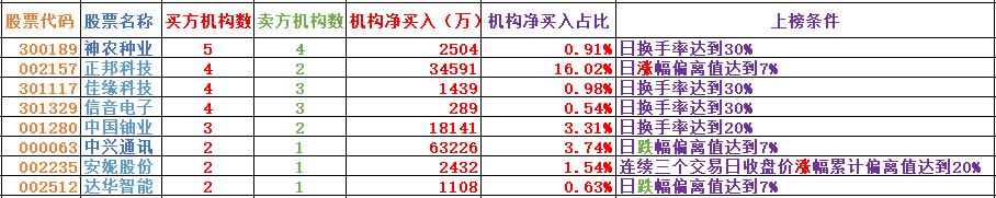 6.每日席位解读(主要是对个股的席位和软件指标进行一些解读,更好的理解席位的用法和软件信号,非荐股,对于机构席位大幅买入的品种,从逻辑上来讲是机构看好的预期,对这类品种需引起思考,对于选取做点评个股的逻辑主要是以下几点:机构净参与家数、机构席位净买金额、净买金额占比等)。