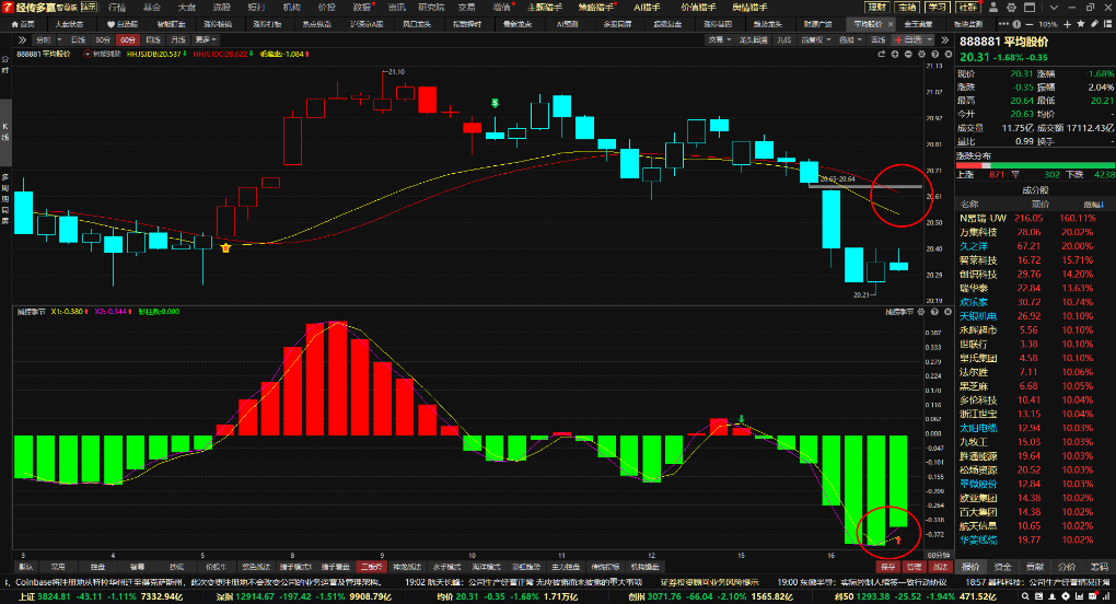 今天平均股价一度下跌2个多点,遇到前期跳空缺口出现支撑开始出现修复,60分钟出现捕捞季节金叉反弹,反弹到辅助线注意部分个股出现承压。